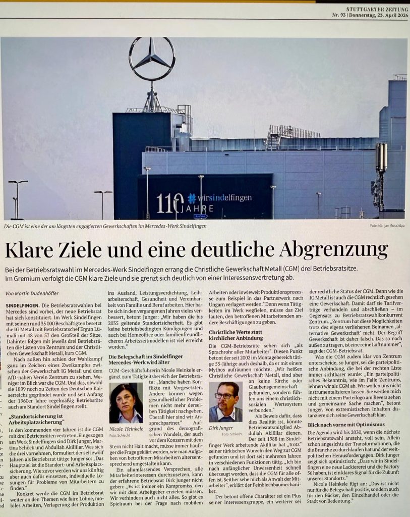 im März 2026 findet die Betriebsratswahl bei uns im Mercedes Benz Werk Sindelfingen statt. Zuvor wird gemäß Satzung eine CGM-Kandidatenliste für die BR-Wahl gewählt.
